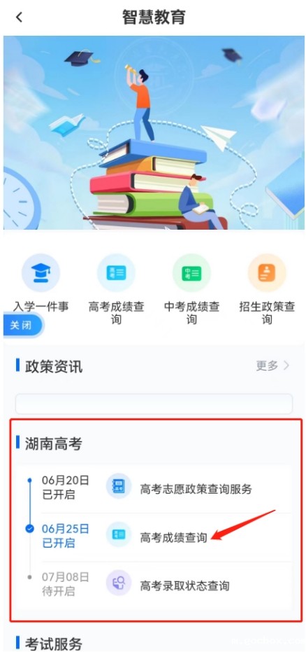 如何查询成绩?考生可通过“湘易办”超级服务端“智慧教育”专区服务查询2023年湖南高考成绩、高考志愿政策及高考录取状态。